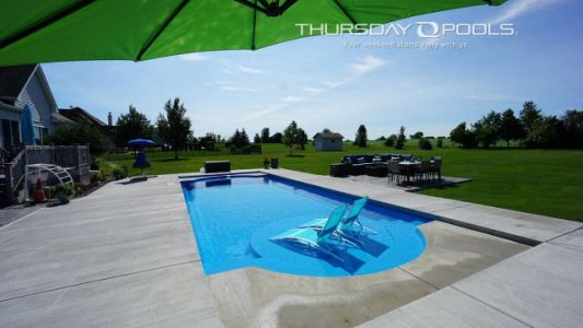 A stately pool that complements traditional and neoclassical home designs, the Cathedral LX will treat you like royalty as you relax, entertain and create priceless memories with family and friends. For this expanded version of our popular Cathedral style, we’ve added a gorgeous round tanning ledge, flanked by two sets of entry steps. Make a statement with a roomy Cathedral LX fiberglass pool. Talk to your Thursday Pools dealer today.